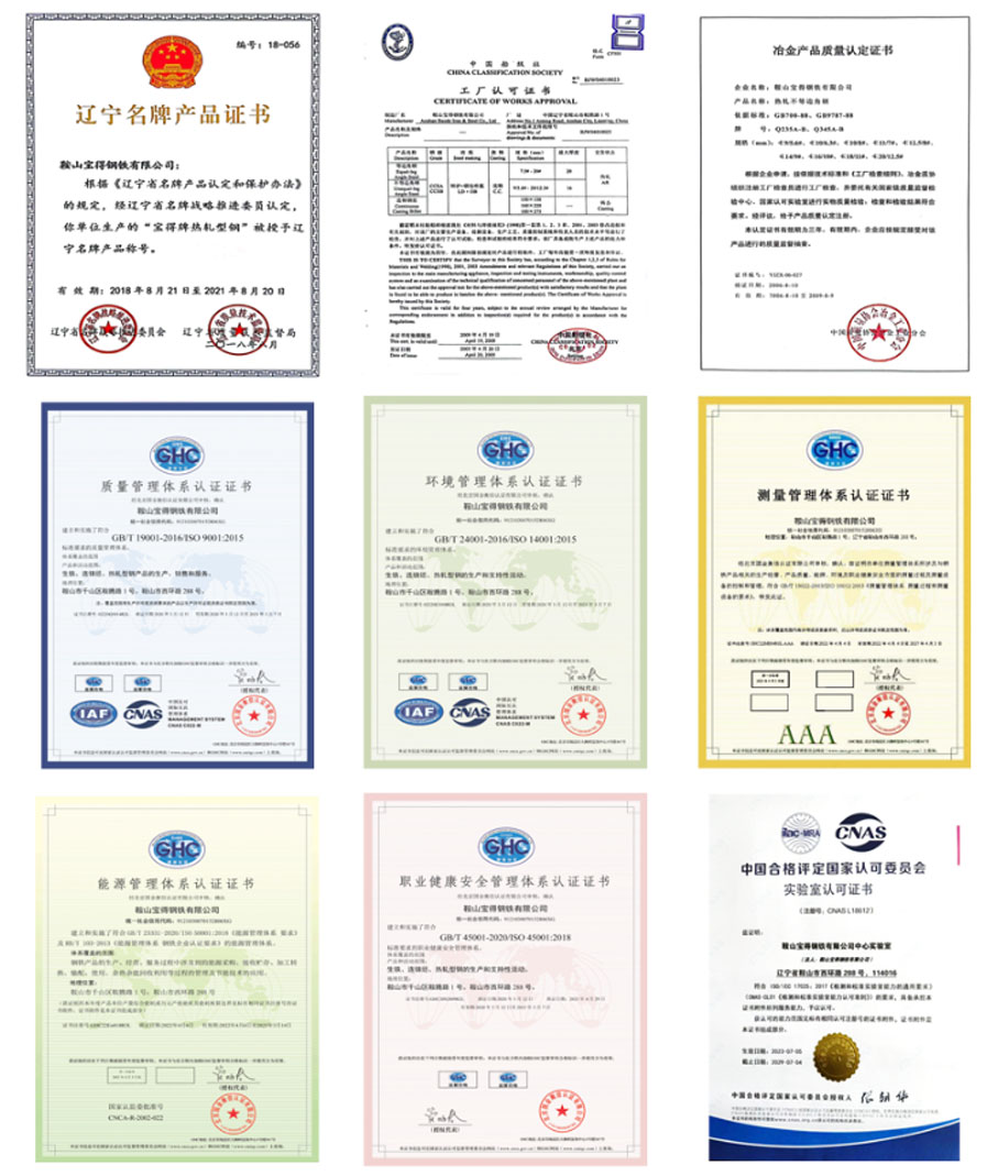 “寶得”牌型材以科學的管理、先進的技術(shù)、嚴格的檢測為保障,產(chǎn)品尺寸精度高,成分穩(wěn)定,性能可靠,表面質(zhì)量好,實物質(zhì)量達到發(fā)達國家同類產(chǎn)品水平,屢獲國家“冶金產(chǎn)品實物質(zhì)量金杯獎” 和“遼寧省名牌產(chǎn)品”稱號。公司通過了GB/T 19001/ISO 9001質(zhì)量管理體系、GB/T 24001/ ISO 14001環(huán)境管理體系、GB/T 45001 /ISO 45001職業(yè)健康安全管理體系、GB/T 23331 / ISO 50001和RB/T 103能源管理體系、GB/T 19022/ISO 10012測量管理體系審核認證,獲得方圓標志認證中心頒發(fā)的“管理創(chuàng)新獎”,取得國家船級社(CCS)的生產(chǎn)工廠認可證書和遼寧省進出口檢驗檢疫局頒發(fā)的“產(chǎn)品出口免檢認可證書”,公司實驗室通過ISO/IEC 17025:2017 審核,取得CNAS實驗室認證。