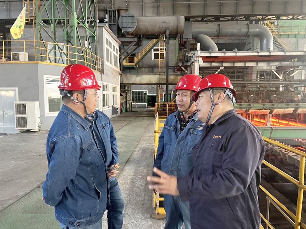 督導(dǎo)組組長(zhǎng)楊殿新在煉鋼廠連鑄生產(chǎn)現(xiàn)場(chǎng)與公司生產(chǎn)經(jīng)理兼安全總監(jiān)陳旭東及煉鋼廠廠長(zhǎng)閆海龍進(jìn)行交流